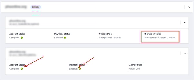 After the updates of the keys, the web and CMS are able to continue processing as normal, with all charges being processed against the new Stripe Account.